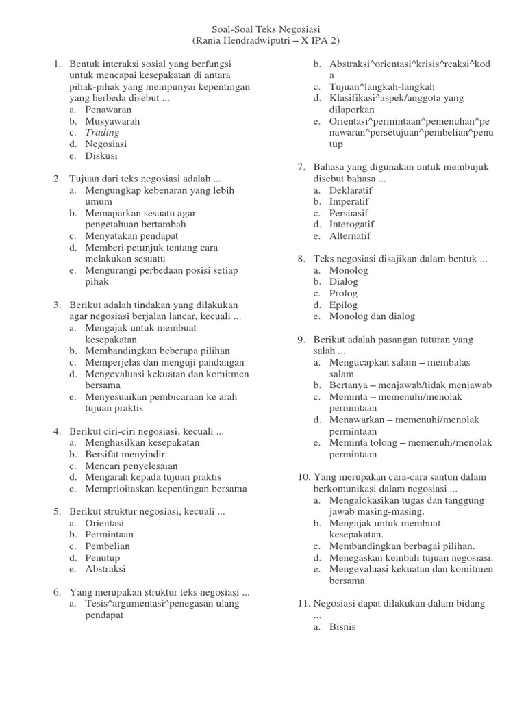 1.sebutkan beberapa hal yang perlu diperhatikan dalam bernegosiasi ! Negosiasi antara dina dan penjual pada saat pembelian tas sekolah. (rania hendradwiputri x ipa 2). Soal dan pembahasan teks negosiasi. 20 soal yang bertemakan tentang bab teks negosiasi.deskripsi lengkap.